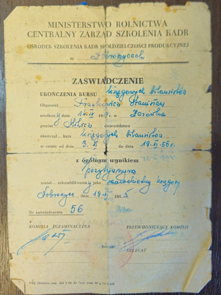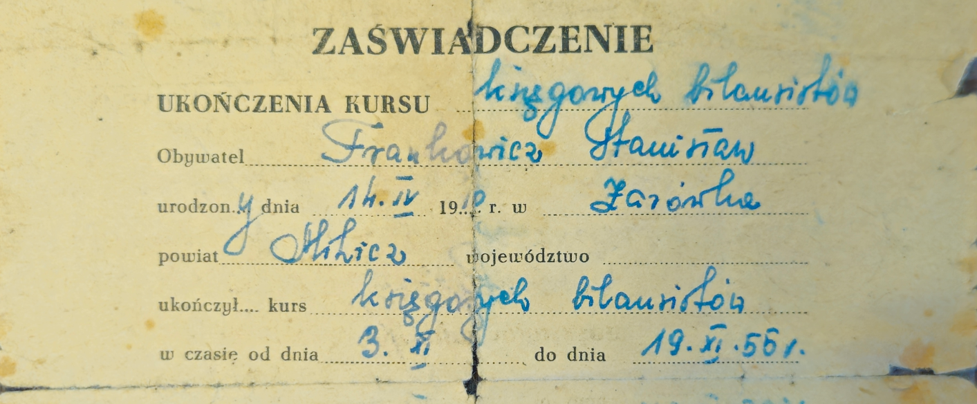 Fragment zaświadczenia o ukończeniu kursu księgowych bilansistów przez Stanisława Frankowicza.